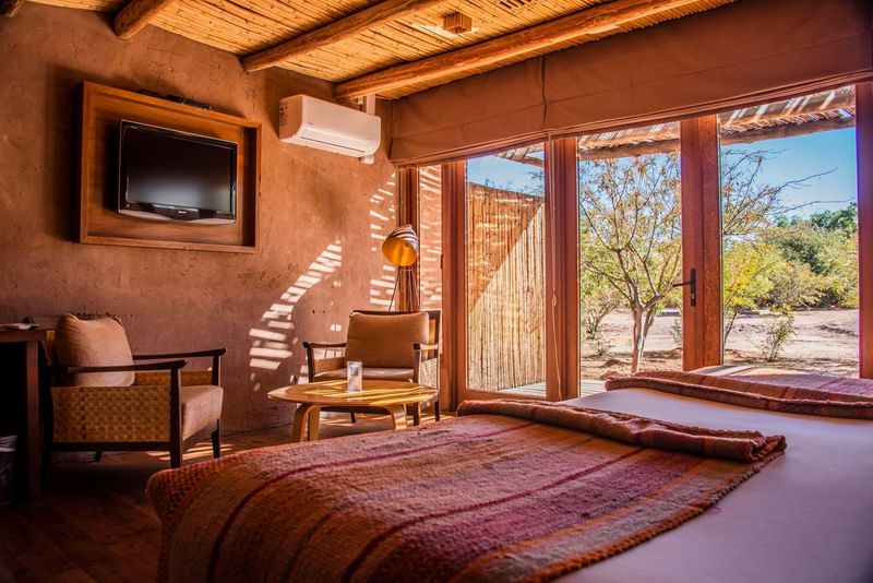 Relaxe no nosso quarto de 54m2, que dispõe de um amplo terrace, decorado com mobiliário clássico e toques minimalistas que se misturam com o ambiente natural.